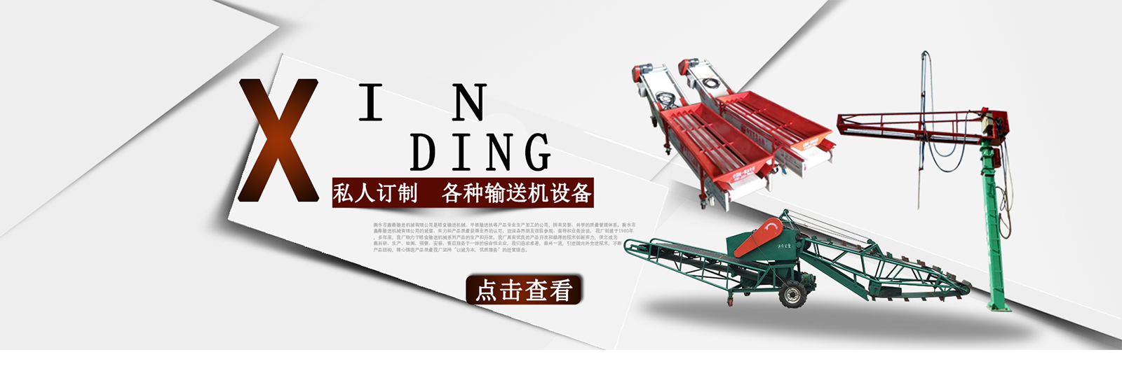 衡水市鑫鼎輸送機(jī)械有限公司是糧食輸送機(jī)械、平板輸送機(jī)等產(chǎn)品專業(yè)生產(chǎn)加工的公司,擁有完整、科學(xué)的質(zhì)量管理體系。衡水市鑫鼎輸送機(jī)械有限公司的誠信、實(shí)力和產(chǎn)品質(zhì)量獲得業(yè)界的認(rèn)可。歡迎各界朋友蒞臨參觀、指導(dǎo)和業(yè)務(wù)洽談。 我廠創(chuàng)建于1980年,多年來,我廠致力于糧食輸送機(jī)械系列產(chǎn)品的生產(chǎn)和開發(fā)。我廠具有優(yōu)良的產(chǎn)品開發(fā)和雄厚的技術(shù)創(chuàng)新實(shí)力,使之成為集科研、生產(chǎn)、檢測(cè)、銷售、安裝、售后服務(wù)于一體的綜合性企業(yè),我們追求卓越,崇尚一流,引進(jìn)國內(nèi)外先進(jìn)技術(shù),不斷產(chǎn)品結(jié)構(gòu),精心鑄造產(chǎn)品質(zhì)量我廠堅(jiān)持“以誠為本,優(yōu)質(zhì)服務(wù)”的經(jīng)營(yíng)理念。。積極拓展市場(chǎng),贏得了廣大客戶的信賴和一致好評(píng)。產(chǎn)品暢銷山西、山東、遼寧、黑龍江、吉林、北京、天津、內(nèi)蒙古等28個(gè)省、市、自治區(qū)。